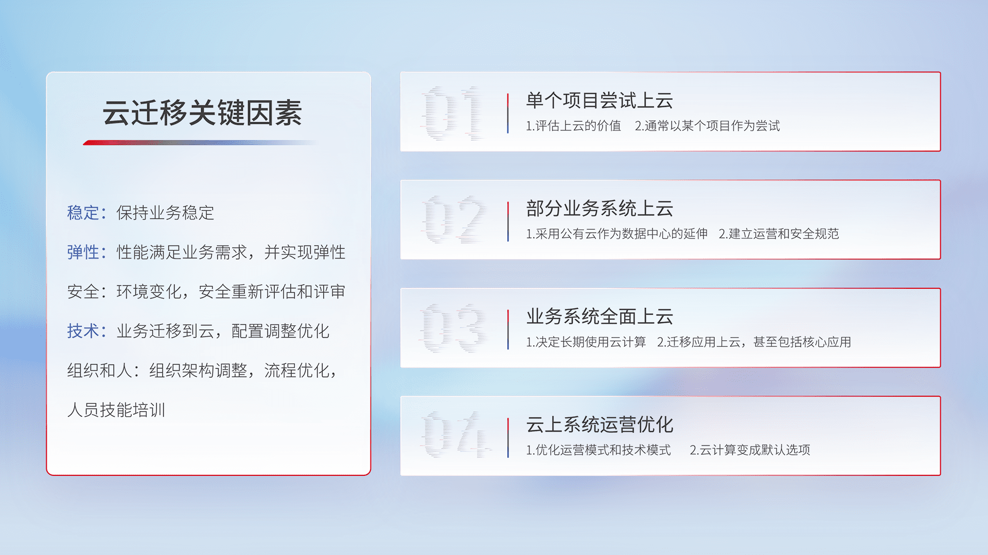 结合实际业务,,从规划设计、、、云平台选型、、、云原生改造、、数据迁移、、、集成交付,,迁移全过程为客户识别最佳上云路径,,做好风险识别管理,,,设计网络架构、、、身份权限、、安全审计合规、、、操作审计、、日志审计、、、监控告警策略、、、多站点容灾设计等,,,对云上基础设施进行整体规划,,,,提升IT治理水平,,,以满足弹性、、、、高可用、、高性能的需求。。。。